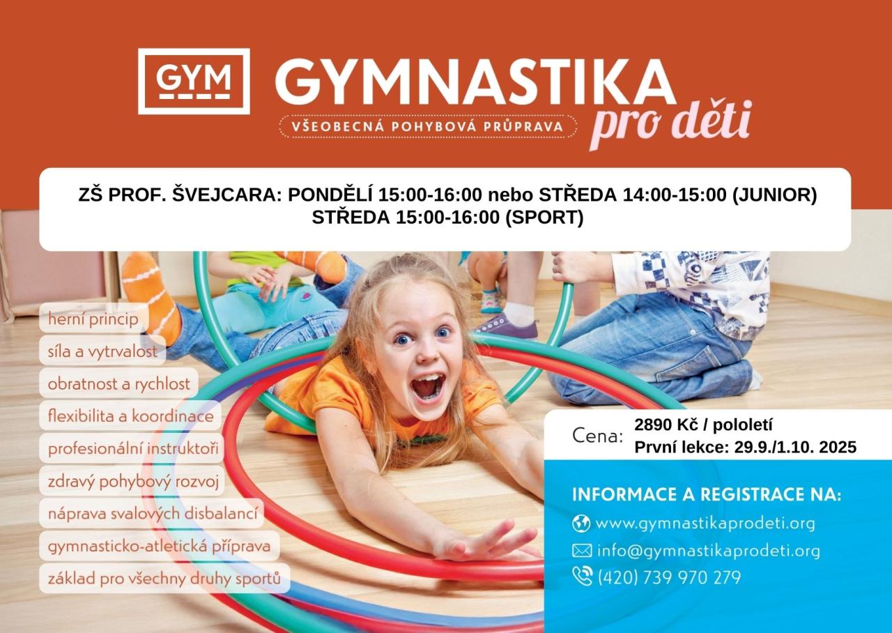 Hlavní náplní je všeobecná sportovní příprava se zaměřením na gymnastiku. Naučíme se kotouly, hvězdy i stojky, zacvičíme si na nářadí a zahrajeme si spoustu her. Dále se zaměříme na rozvoj koordinace, rychlosti, vytrvalosti a flexibility. Trenér si vyzvedne děti před začátkem lekce v družině a po lekci děti odvede zpět do družiny nebo děti předá rodičům.